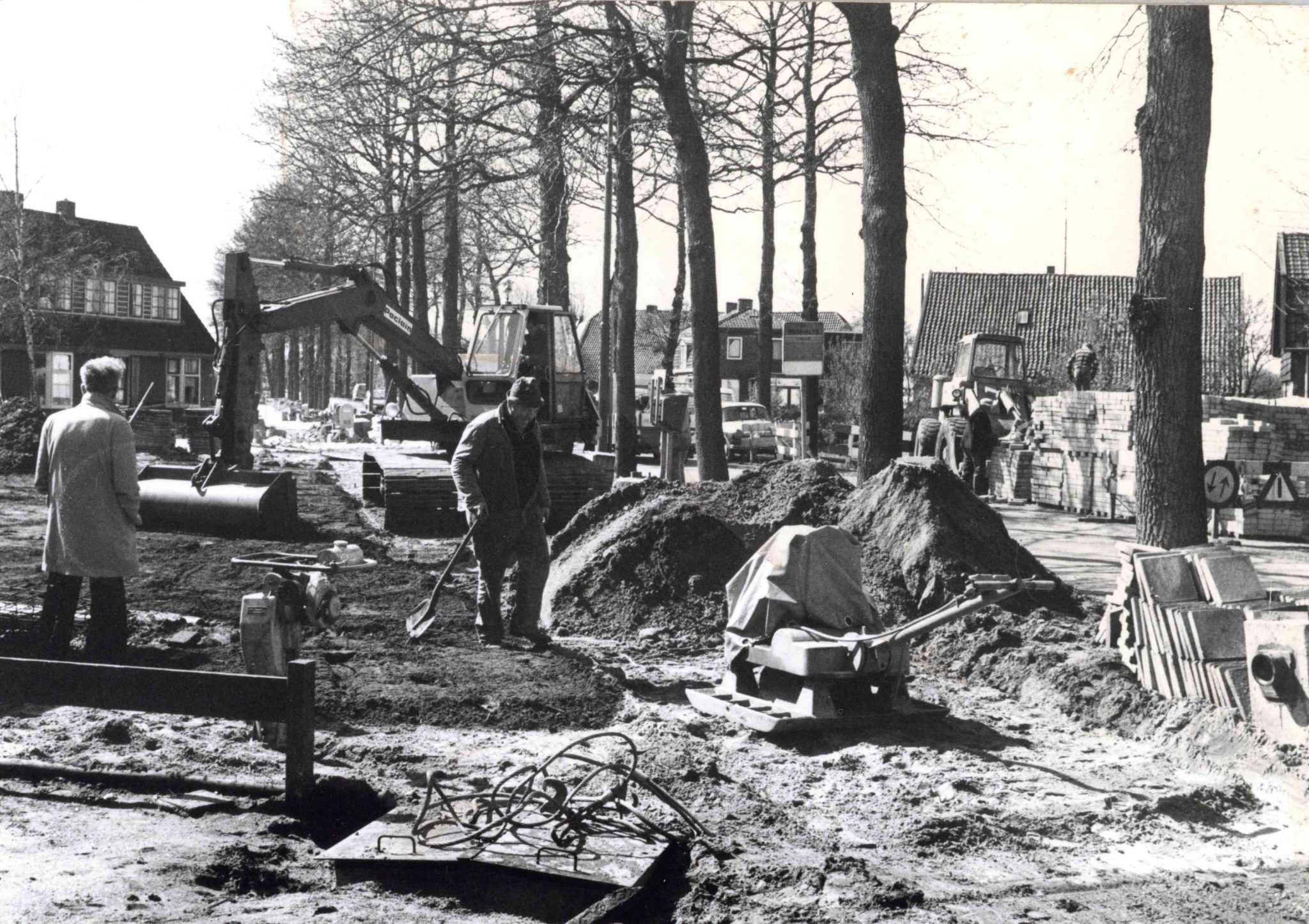 In 1977 werd een begin gemaakt met het aansluiten van de woningen in Maartensdijk op de riolering. Toen Ad Kon deze foto in april maakte, waren op de Dorpsweg inmiddels 75 woningen aangesloten. Intussen ging het werk in de rest van de gemeente verder.