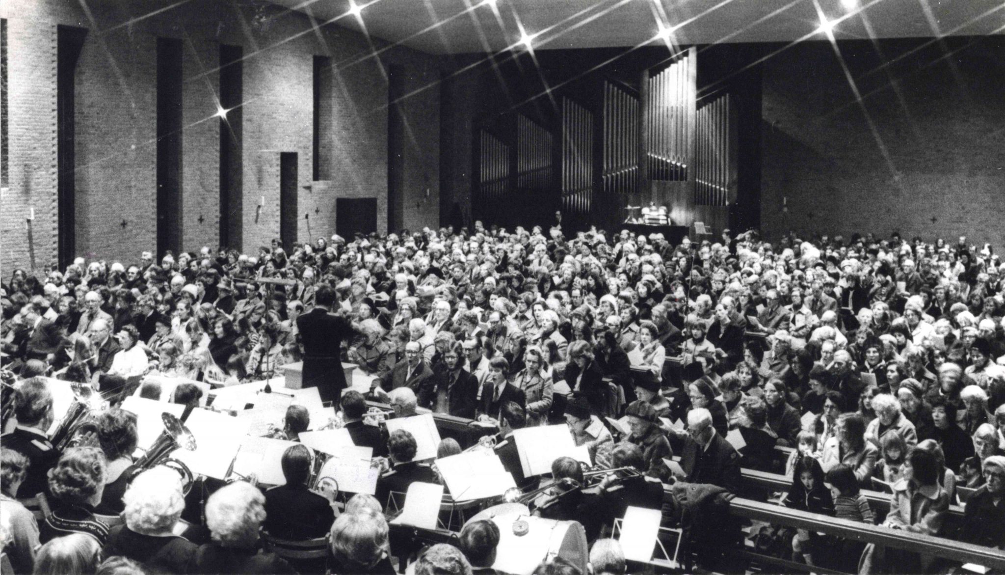 In de jaren ’70 van de vorige eeuw konden de kerken bij gelegenheid stampvol zitten, maar begonnen de zondagse bezoekersaantallen al af te nemen. De Laurenskerk, begin jaren ’60 met het oog op bevolkingsgroei gebouwd in Brandenburg-West moest in 2014 het veld ruimen. Op de voorgrond leden van de Koninklijke Biltse Harmonie.