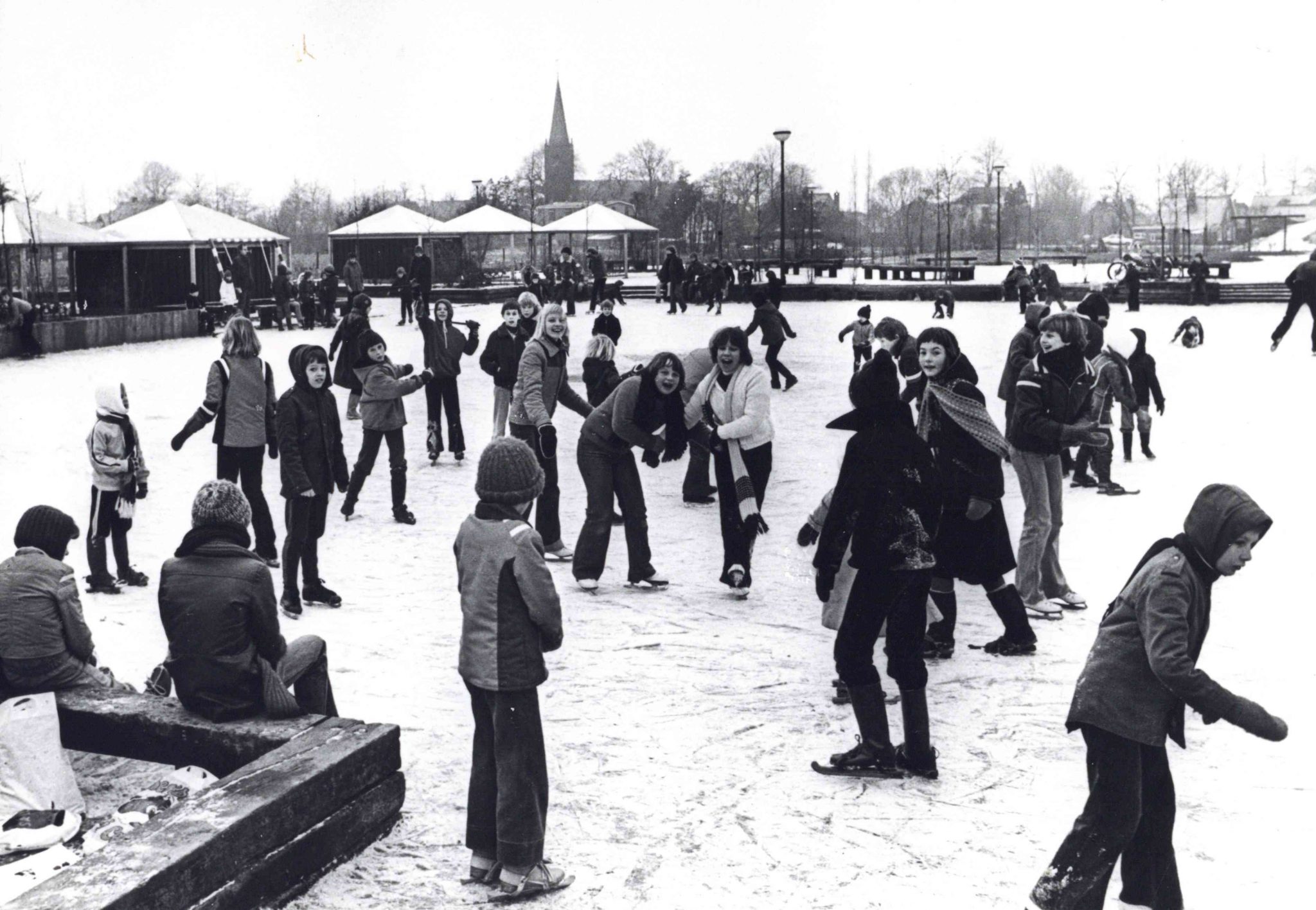 Na een aantal kwakkelende wintermaanden, ging het in februari 1978 toch nog flink vriezen. Ad Kon legde vast hoe de kinderen konden schaatsen op het ondergelopen en bevroren schoolplein van de Martin Luther Kingschool in Maartensdijk.