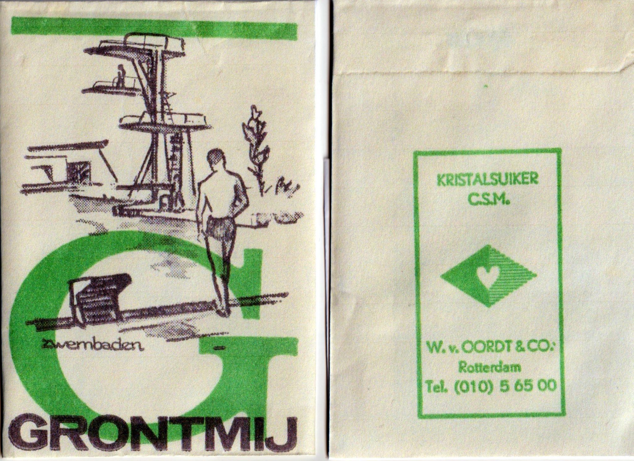 In de jaren zeventig ontwierp de Grontmij NV. de voorganger van het huidige zwembad Brandenburg. Afgebeeld is een suikerzakje dat zwembaden in verband brengt met de Grontmij NV. [Het suikerzakje werd aan Online Museum De Bilt geschonken door de heer Jan Noorlandt in Rhenen. Foto Anne Doedens.]