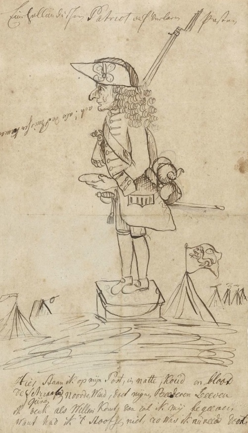 Tijdens de burgeroorlog die in de Republiek in 1786/7 uitbrak, speelden ook de toenmalige media een rol van betekenis. Tot die media hoorden pamfletten, kranten en boeken, zoals de Haagse Correspondent waarin de spot gedreven werd met de aanval op een stelling van de stadhouderlijke troepen in september 1787. [Karikatuur van een Patriot op wacht, 1787. Anoniem. Rijksmuseum Amsterdam.]