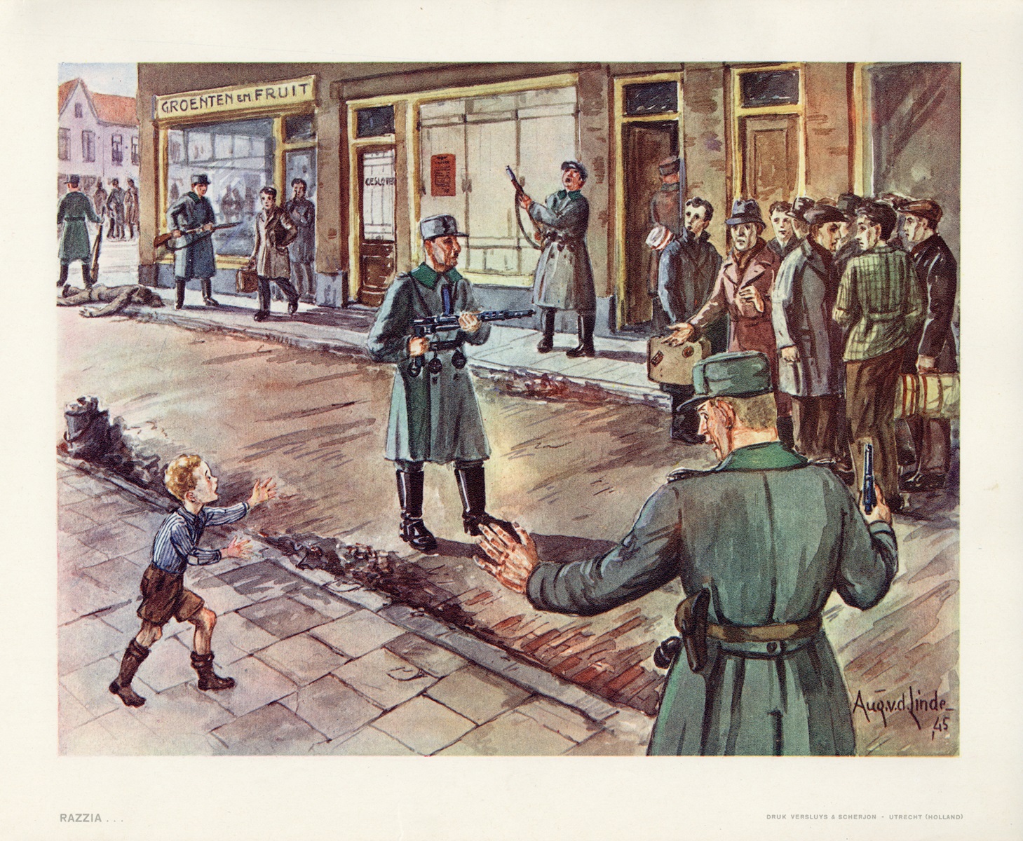Op maandag 18 november 1946 viel in het Nieuw Utrechtsch Dagblad te lezen, dat ‘Pieter Hey te Maartensdijk’ bij cassatie tot levenslang veroordeeld was wegens het oppakken van onderduikers. Het ging hierbij om een omzetting van een paar maanden eerder uitgesproken doodvonnis. [Afbeelding van een razzia waarbij mannen worden opgepakt en bewaakt door Duitse soldaten tijdens de hongerwinter van 1944/45. [Utrechts Archief, beeldbank, nr. 36051. Vervaardiger A.G. van der Linde.]