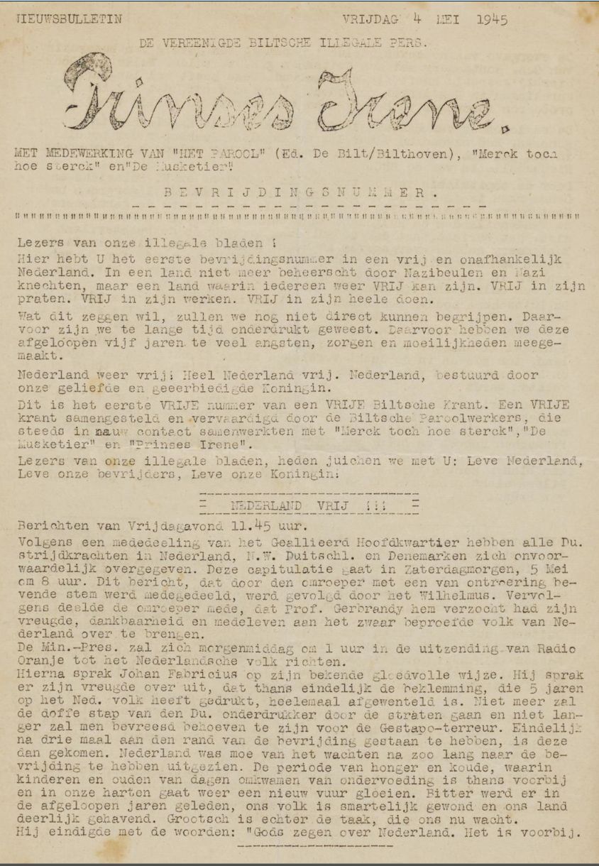 Van 1943 tot 1945 was in De Bilt een kleine maar vastberaden verzetsgroep actief, die bestond uit elf mannen en twee vrouwen. De groep, die zich later aansloot bij de Binnenlandse Strijdkrachten (B.S.), speelde een rol in het verzet tegen de Duitse bezetter. Afbeelding: het bevrijdingsnummer van ‘Prinses Irene’, het verzetskrantje dat de groep uitgaf. (Delpher)