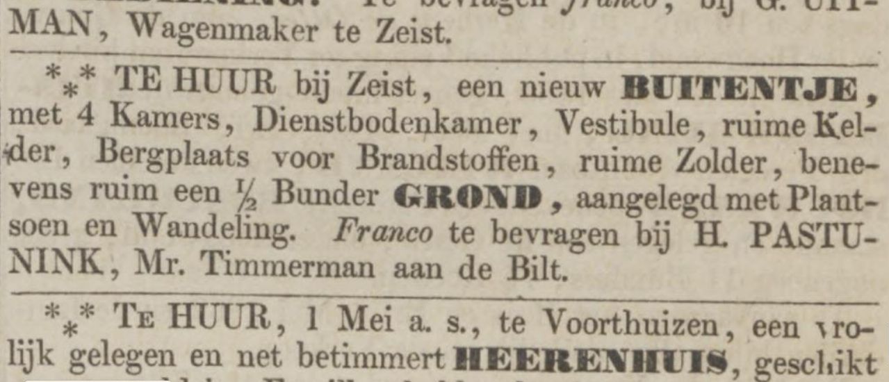 In de eerste helft van de negentiende eeuw speelde Hendrik Pastunink een belangrijke maar lang onderbelichte rol in de bouw- en beheergeschiedenis van landgoed Vollenhoven bij De Bilt. Zijn loopbaan laat zien hoe een ambachtsman zich binnen de context van een groot landgoed kon ontwikkelen van timmerman in loondienst tot zelfstandig aannemer, met invloed die tot ver buiten Vollenhoven reikte. Afbeelding: een advertentie van Pastunink in de Opregte Haarlemsche Courant van 12 maart 1862.
