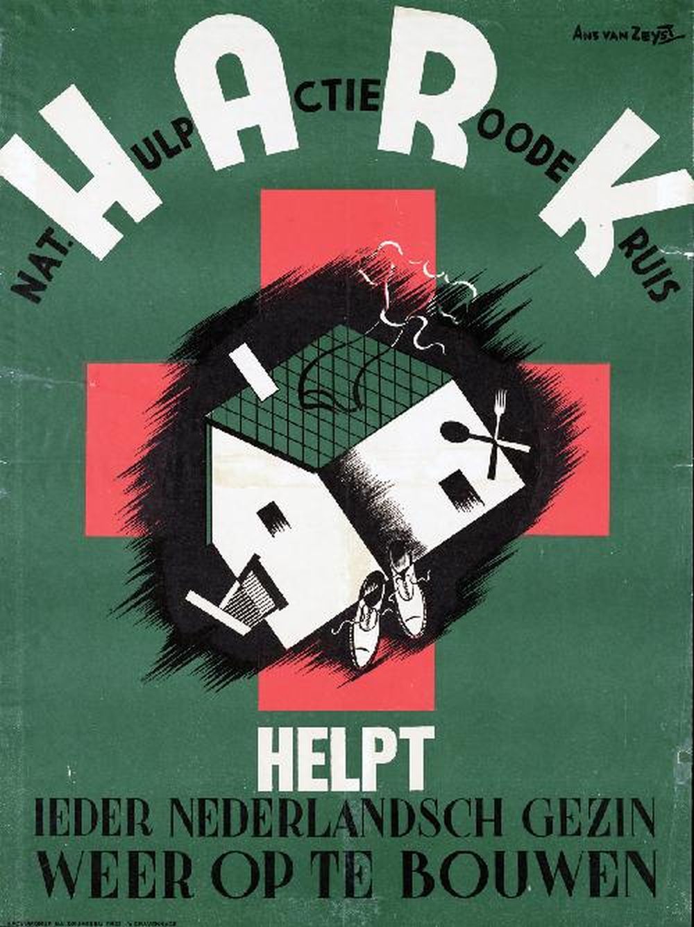 Direct na de bevrijding in 1945 was Nederland een land in puin. Om de wederopbouw in goede banen te leiden, werd de Hulp Actie Roode Kruis (H.A.R.K.) opgericht: een nationale organisatie die hulpgoederen moest verdelen onder oorlogsslachtoffers in heel het land. De Bilt en Bilthoven sloten zich enthousiast aan. Wat begon als plaatselijke hulpverlening, werd een intensieve adoptie van twee zwaar getroffen Zeeuws-Vlaamse gemeenten, Aardenburg en Schoondijke. Afbeelding: een poster van de H.A.R.K.
